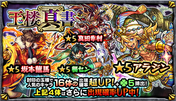 モンスト アラジン 坂本龍馬 など 封印の玉楼 で人気のキャラ16体が大集結したガチャ 玉楼真書 が開催 Boom App Games